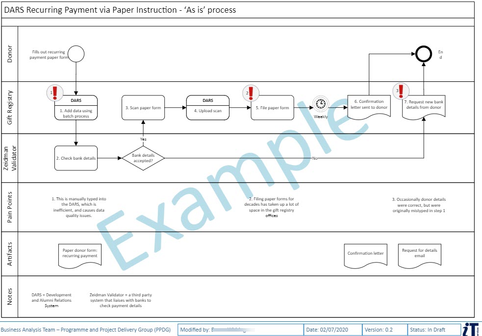 - Within the Business Analysis team we’ve created ‘As is’ and ‘To be’ process templates and examples, and created a shapes stencil (a library of all the shapes we would use when mapping) to ensure a level of consistency and quality