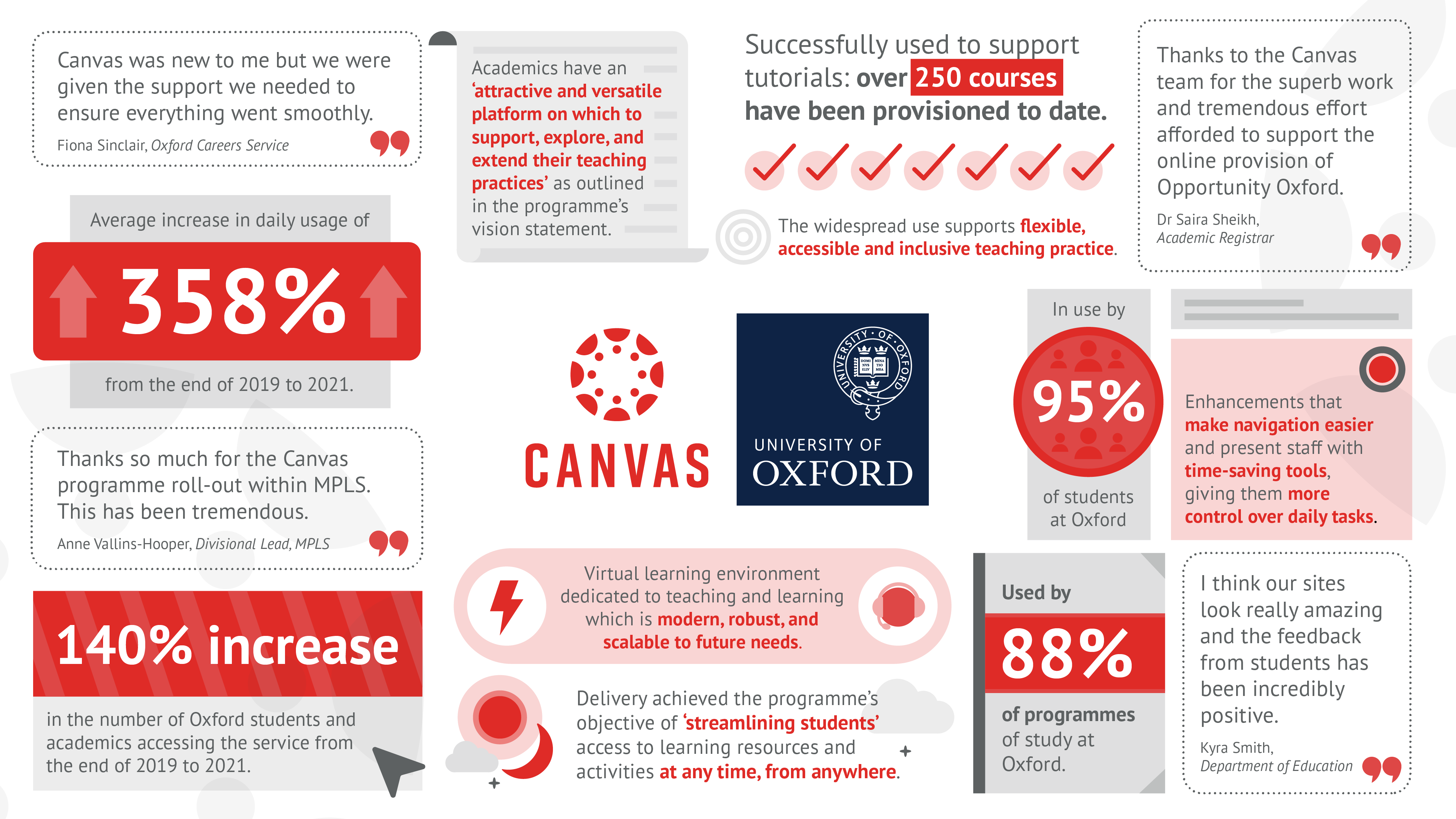 After three years, 26 early adopters, nearly 600 programmes of study, thousands of courses and one global pandemic, the Canvas programme, responsible for the rollout of the Canvas virtual learning environment across Oxford, will close at the end of July 2021. All operational responsibility has been transferred to the Centre for Teaching and Learning (CTL) and IT Services.
