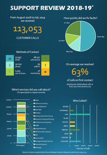 During the twelve months covered by the report over forty per cent of the calls we received were in relation to three main areas: Nexus365, Financial Systems, and Managed Desktop Services. This is consistent with previous years and helps us to focus our resources. Overall the number of calls increased by around five per cent, but despite this the proportion of calls we resolve in our first conversation with callers remained high at around sixty per cent, and we are pleased about this.  But what makes us particularly happy is that there was a huge shift towards self-service with well over ten thousand more self-service requests than the previous year! This is great news as this directly impacts our ability to provide predictable, reliable support to our customers across Oxford University.