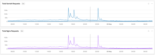 Vaccine trial site traffic graph for the COV-Boost 3rd Dose trial launch. The graph shows spikes in visitor numbers when the Secretary of State for Health read out the URL on the 6pm and 10pm news on 19 May 2021.